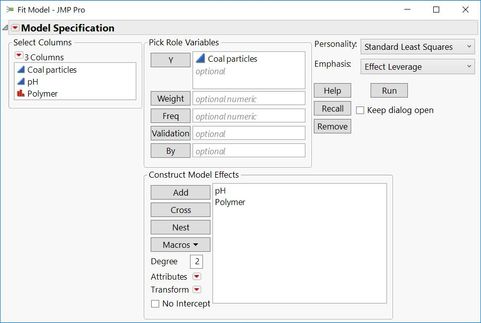 • Fit Least Squares: Select Analyze > Fit Model. Enter the column of stacked measurements in Y role. Select the predictor X column and the label column. Click Macros and select Full Factorial. Click Run.