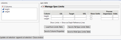 I have a script that will bring up a column dialog and the manage spec limit platform. I'd like to be able to click the update button and have the manage spec limit table reflect the selected columns. I have not be able to figure this out so the work around is to have the window close and then reopen calling some global variables.