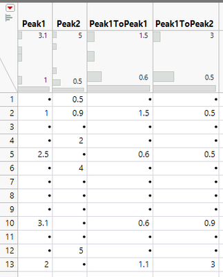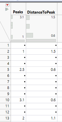 I’m fairly new to JMP, and I’ve come across a problem with which I’m really struggling. I use JMP Pro 17. I have a data sheet with one column with distance from a starting point (“Distance”) and one column with a signal intensity value at that distance (“Signal”). I’ve found signal local maxima (peaks) by making a formula column which yields a 1 if the signal value at that distance is the largest value within a given range (Signal[row] == max(Signal[row-n, row+n]), else missing. My problem, however, is the following; I wish to make another formula column which gives the distance at each peak to the closest peak.