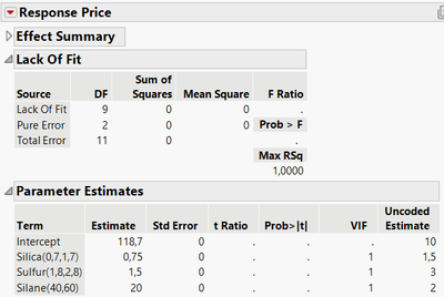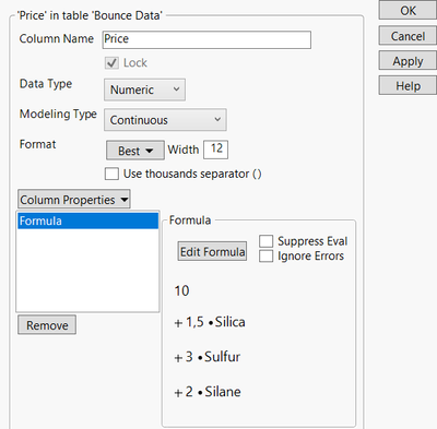 As an example on dataset "Bounce Data" with the response "Stretch", I added a column "Price" with a defined equation:
