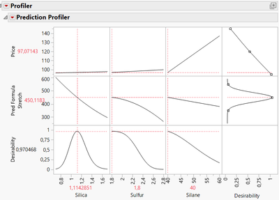 Once a model build on response "Stretch" (Y1), I save the Stretch Prediction formula and Launch the Prediction Profiler Platform with the two formula (predicted Stretch formula and the one calculated for Price in the datatable) to optimize both responses :
