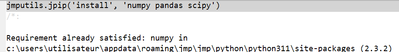 I am trying to use a piece of code in JMP 18, but I am not sure I understand how it works. I install the pythonn packages at the very beginning, then I send my variables to Python and run the Python code. But I always get one of the following errors: Either it does not detect numpy, even though numpy is installed, or it no longer detects the variable I just sent.