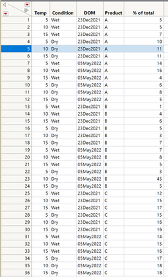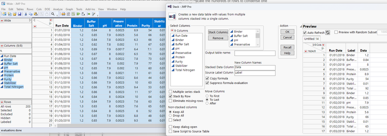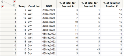 I have a legacy table which is full of data in JMP17. Currently it has columns which help identify the data (Temp, Conditions, DOM, etc). The values which we measured in this table include about 45 separate types of product and we will get a response for each of the 45 for each row. We have it set up right now to have that each of the 45 products has its own column for the value, however this limits me in how I can graph - for instance I cannot graph based off of each product or specific products. My first idea was to create a new column which has each product name but that is a ton of manual copy+paste and I want to avoid human error as this is important source data. How can I reorganize my data table to optimize the flexibility to graph without having to duplicate the hundreds of rows to condense one column (see below for example). I am open to any and all ideas! Thanks!