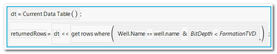returnedRows = dt << get rows where( :Well.Name == "a well's name" &
