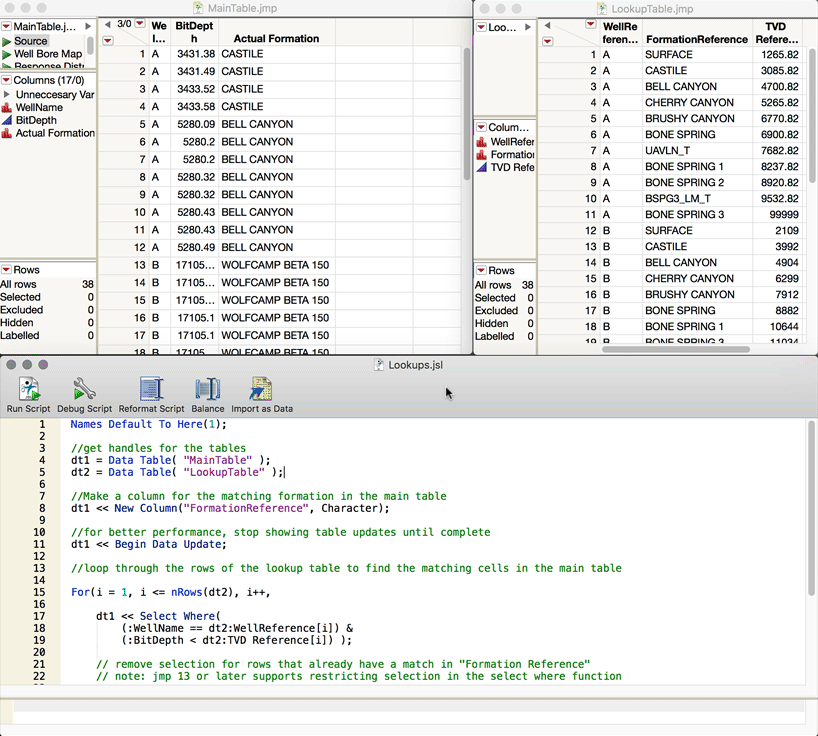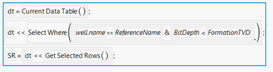 The above JSL would create a matrix of row numbers (returnedRows) after searching the entire data table to find where a column named Well.Name has a name of "a well's name" and a column named BitDepth equals the the same value in a column named FormationTVD.  From you explanation, I am just guessing what Well.Name, BitDepth, FormationTVD and Formation really are.  But once the rows that you need to be identified, are selected, then the returnedRows matrix can be stepped through, and actions taken on those rows.
