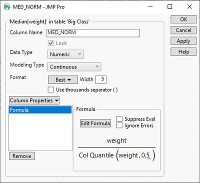 Let's say I have a column of values representing a population. I want to find the median of that population and then create a new column which takes each individual row value in the original column and divides it by the same median value for every row and saves it to the new column. In effect it is a normalization to the median value.