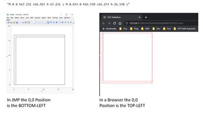 I'm trying to generate a set of Standardised SVG Strings that can be used both in JSL Scripts and in a Web Application. However, from my initial investigations I notice that for the same SVG d-Path String, JSL draws the image using the BOTTOM-LEFT as the 0,0 Point and Browsers use the TOP-LEFT as the 0,0 Point.