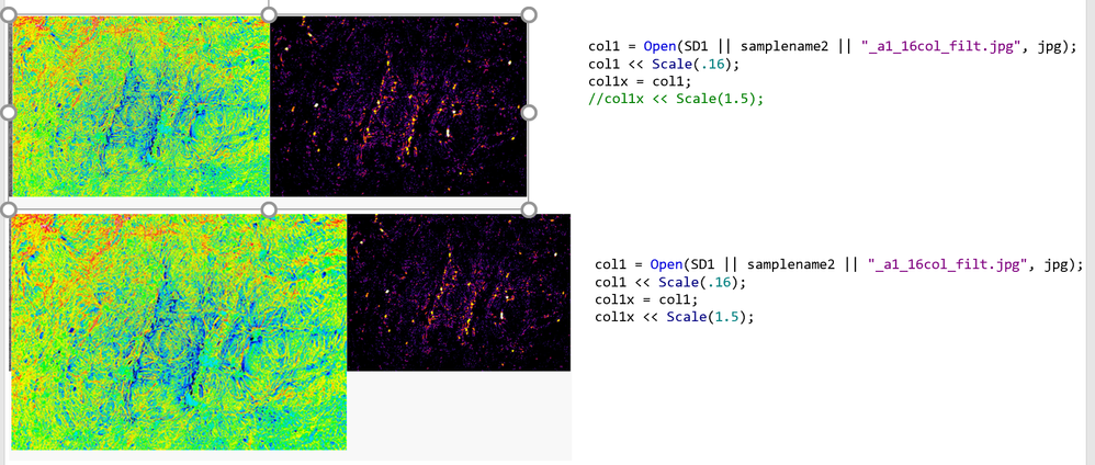 As an example, I tried scaling an opened image and save as "col1" which would be in "coltwin_1. The second scaled variable is "col1x" used in "coltwin_2" arrangement. However when using col1x = col1 << Scale(1.5), the scale for col1 propagated through both layouts.