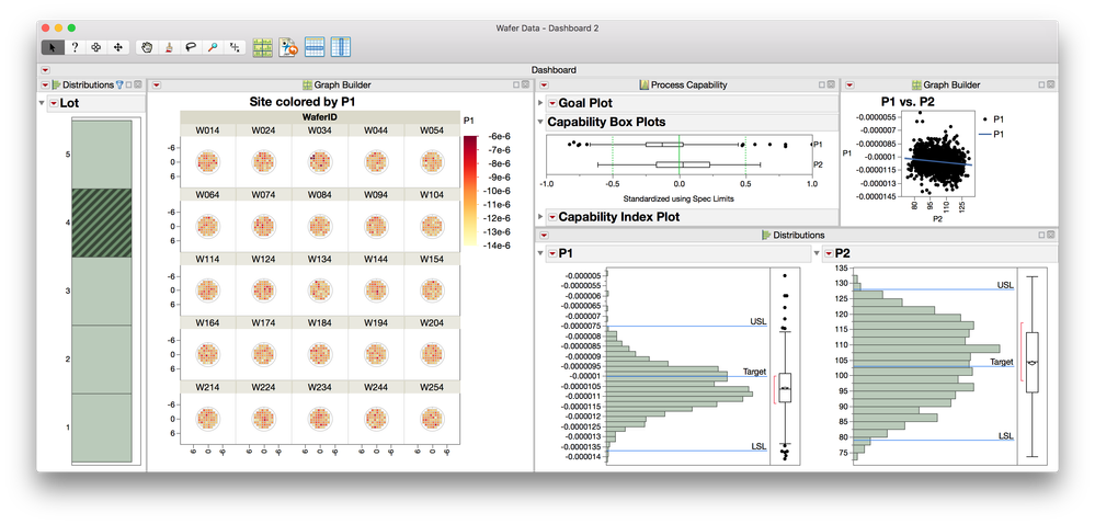 Attached is an example screenshot of a dashboard using the Filter + 1 template from the Dashboard Builder. This dashboard is in summary mode and the three graphs line up in columns. The distribution of 'lot' acts as a selection filter, where selection in the one graph cause a local data filter effect on the Graph Builder graph as well as the two statistical platform outputs from Process Capability and Distribution "downstream".