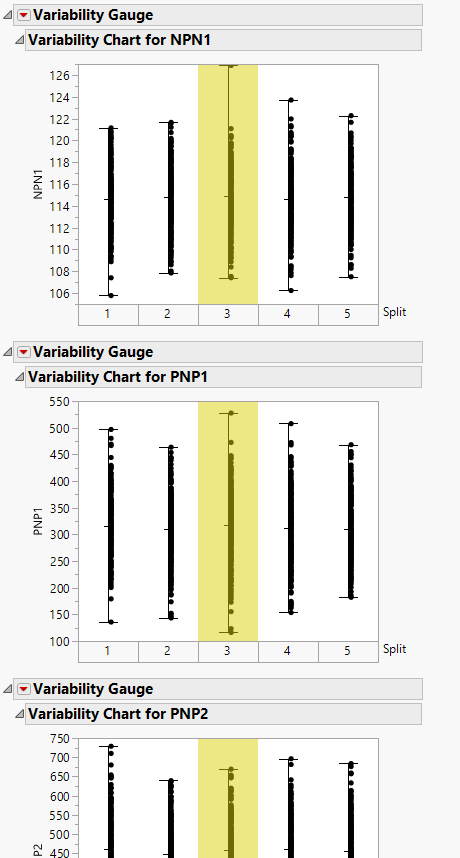 vc = Variability Chart( Y( Eval( colNames ) ), X( :split ), Std Dev Chart( 0 ) );