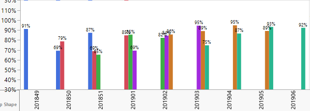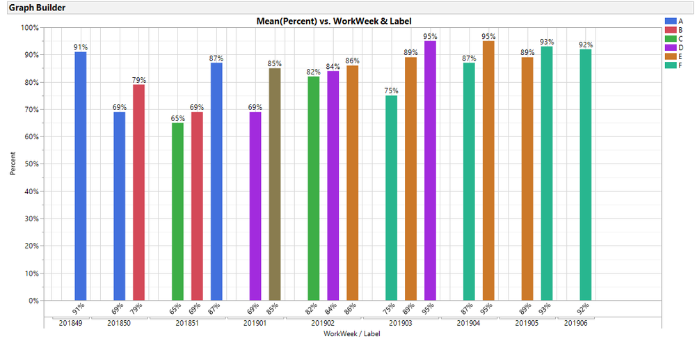Plot #1 - Frame Size Increased, Bar Width ReducedThis next graph was uses a custom X axis that only plots the non-missing categories for that WorkWeek. The attached table displays the formula to create the custom column WorkWeek_Item.