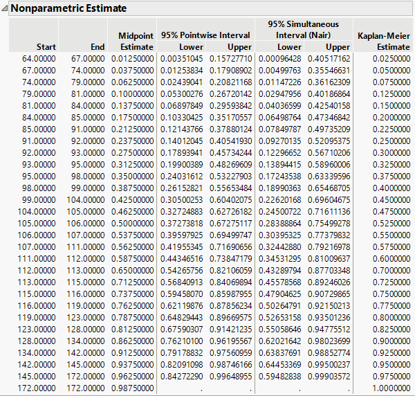 The Nonparametric Estimate in Life Distribution provides the same information in the last column: 1 - failure = survival = 1 - 0.9 = 0.1. Many analysts prefer the mid-point estimate to the original K-M estimate.