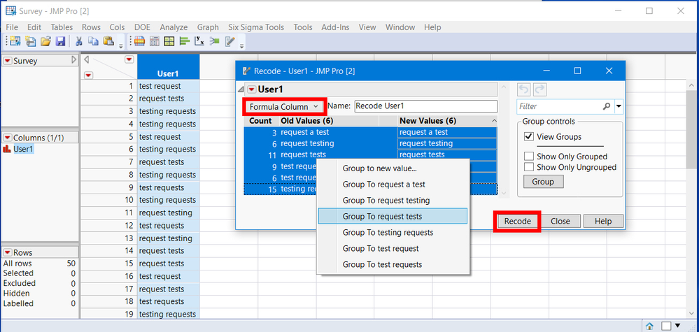 The attached screeshot shows the table and the interactive interface. The red box around Formula is a menu option to create a New Column (of values), a Formula (column) or In Place (replace values). I chose Formula and named the column Recode User1. Next, select all options and right click, then a pop-up menu of options appears. The options are to use one of the numerous phrases, or use a new value. Make your selection and press the Recode button.