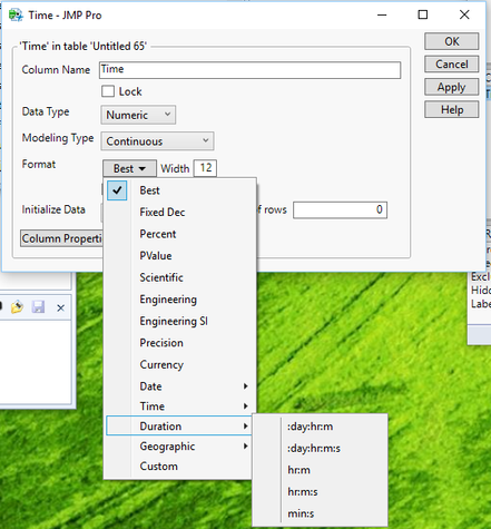 Thanks, that worked. But I want to be able to script this change to duration. I clicked on Source>Edit but there seems to be no JSL for the duration change. I used the following code: