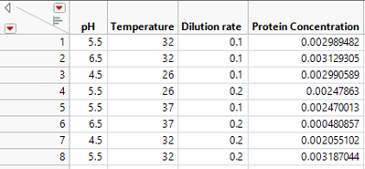 I have added your data table with the following scripts: Design evaluation (for estimating the aliasing, power, etc.) and Fit Model (for initial assessment). Simply click on the green arrows in the upper left zone). The outputs need interpretation via SME.