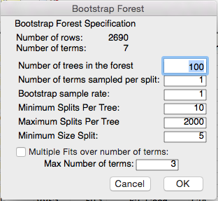 Bootstrap sample rate: The default is 1, which means the bootstrap sample will have the same number of rows as the original data table. The bootstrap sampling happens automatically and you don’t actually ever see the separate bootstrap samples. If you choose a value that is less than 1, then the bootstrap sample will have fewer rows that in the original table. It’s best to use the default here.