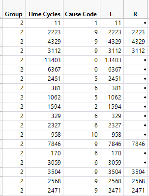 - If cause code is not 9, copy Time Cycles to Left, but fill Right with a missing value. You may recognize this represents a right censored observation. Take the first row as an example, whose failure cause is 1. Because it is competing cause, cause 1 happened first. If we pretend 1 did not happen, and the system will fail due to cause 9, the failure time should be some where after 11 cycles, but we don't know when. So for this row, the software copies 11 to Left, and fill Right with a missing value.