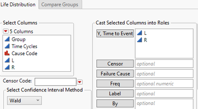 - Now Left and Right are the new columns that should go to Y Time to Event role, if you want to fit a distribution to cause code 1.