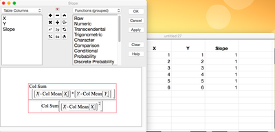Col Sum( (:X - Col Mean( :X )) * (:Y - Col Mean( :Y )) ) /