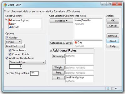 I need to plot the line for the averages (with error bars) like you can do in prism (my supervisor wants me to use jmp)