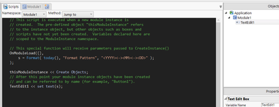 Below are the default arguments included in a Module script - anything that uses the symbols created by the Module has to be placed after the thisModuleInstance << Create Objects; line: