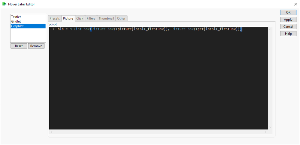 hlb = H List Box( dt:picture[i], dt:pet[i] );