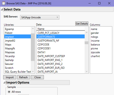 You can then select the library and data set that you want to import into JMP. When you click Import, JMP will import the SAS data set, and if it sees that the data set contains user-defined formats, it will attempt to convert them to JMP value labels. In order for that to work successfully, the user-defined formats need to be contained in a format catalog that SAS is configured to look for formats in, which may require you to have LIBNAME and FMTSEARCH statements in the autoexec.sas file that SAS uses when it starts up. But, if the format information can be found, JMP will do its best to map the user-defined formats to value labels.