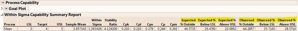 The expected percentages are what you would expect to be outside, below the LSL, or above the USL based on the distribution chosen (by default, the distribution is normal). So you would fit a normal distribution (or whatever distribution you chose) to the data and calculate these percentages from that. The observed percentages are based on the actual data. So this would be the actual percentage outside, below LSL, and above USL.