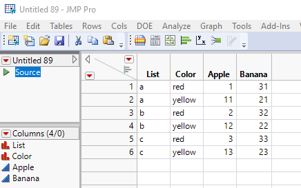 New Column( "Banana yellow", Numeric, "Continuous", Format( "Best", 12 ), Set Values( [31, 32, 33] ) )