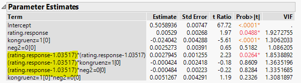 Thanks for posting that. It clears up a lot of confusion. Centering is not going to do anything for you in this case since you are not asking to model any higher order effect that involve rating.response.