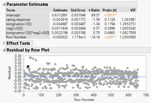If you add a row-order column as an additional effect, you can account for that (still leaves some major questions). However, the row order is literally the only effect that is statistically signficant.