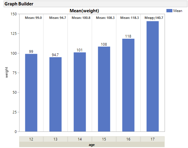 Note that the format for column weight was Fixed width=5 and decimals=0, so the mean has exactly 1 decimal point in the caption.