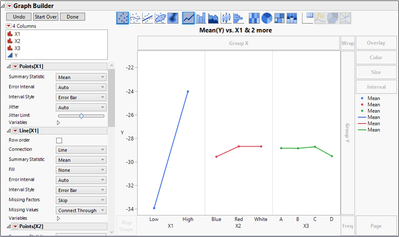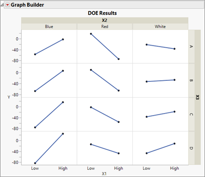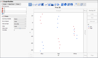 You can use the same steps to create the interaction plots for X1-X3 and X2-X3. Those steps are not shown here, but the graphs are shown below. Also included is a graph that shows all 24 observations using the Group X and Group Y roles.