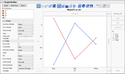 It can be instructive to view the interaction plot with X1 on the X axis and X2 in the Overlay role.