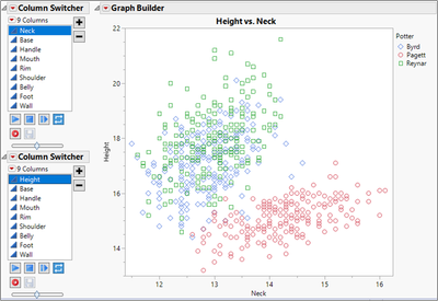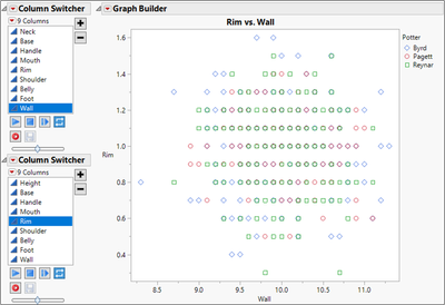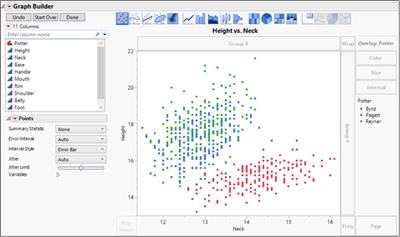 7. The Potter data table contains measurements taken on different examples of pottery jugs from three different potters. Use Graph Builder to make a scatterplot of two of the continuous variables, then switch columns to find relationships that vary depending on the potter.