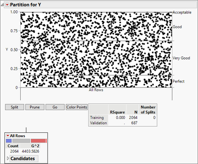 Your results will vary due to the random nature of the holdout procedure. The misclassification rate on the validation set is about 27%. The misclassification rate of the Acceptable group on the validation set is about 57%. About half the observations in the Acceptable group were misclassified as Good.