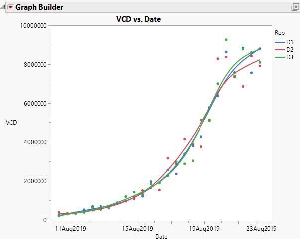 4. Build a graph of VCD by Date overlaid by Rep. Note that Date might be imported as character data. If so, change to Numeric, Continuous, with format DDMonyyyy h:m.