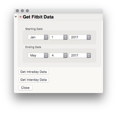 This Add-in uses the JMP to R connection to download your Fitbit data directly via the Fitbit API, and creates a JMP data table with either your inter- or intra-day data (intraday data includes measurements at 15-minute increments, rather than daily totals). Included columns are: time, caloriesBurned, caloriesIntake, steps, distance, floors, minutesVery (number of minutes fitbit determined you were "very active.")