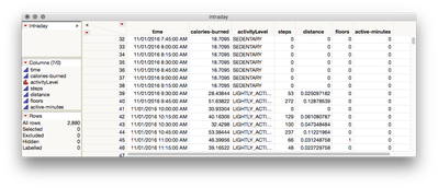 Intraday data includes time, calories burned, activity level (as classified by fitbit), steps, distance, floors, and active minutes with separate measurements every 15 minutes for the date range you select. For the month of November, the following table is generated (again, be advised this process takes a while for a large data range. For this month of data this took about 45 seconds). The following table was produced: