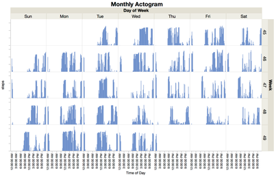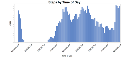 You'll notice there are some rows with no data -- those represent times when I wasn't wearing my fitbit and so it wasn't logging any activity (if you wear your fitbit during only waking hours this provides an easy way to extract data on when you are sleeping vs awake.