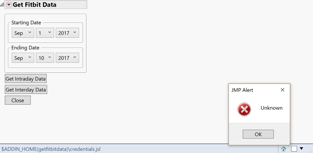 The Fitbit Data Downloader for JMP freeses my computer whenever I click on it. It loaded OK into my addins and I have R open on my computer. However, as soon as I click the Get Fitbit Data addin, the get the rotating ball.