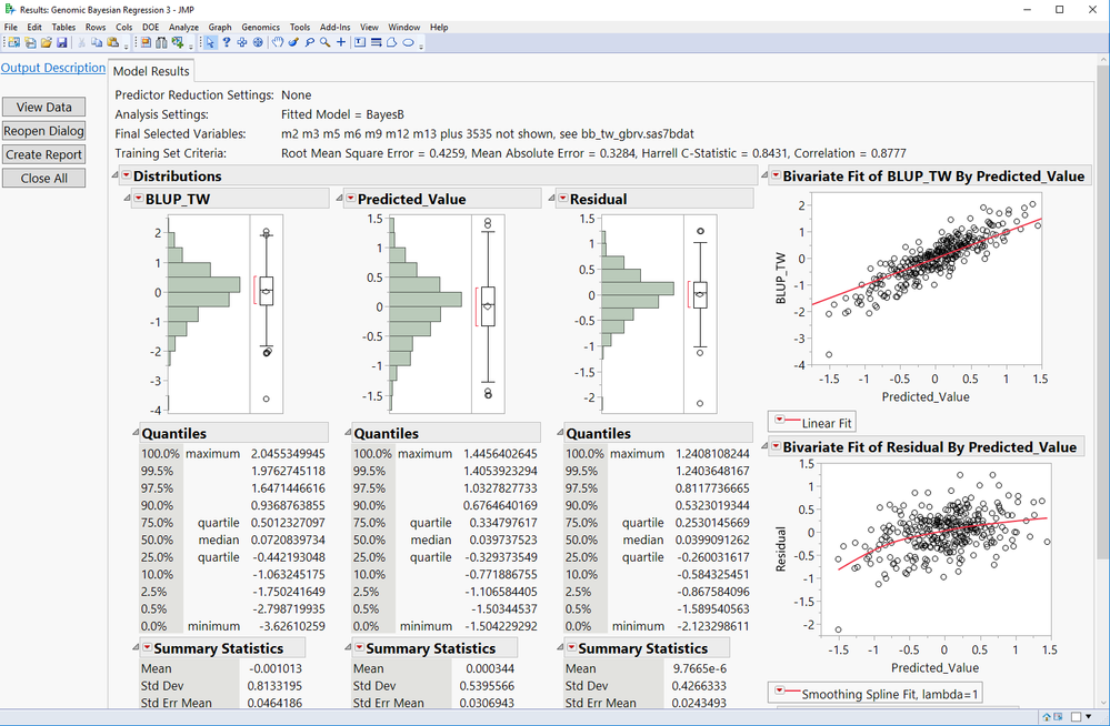 The Genomic Bayesian Methods Add-in is a wrapper around the Bayesian Generalized linear Regression (BGLR; de los Campos and Rodriguez 2014, Genetics 198:483-495). Genetic marker effects can be estimated using Bayes A, Bayes B, Bayes C, Bayesian LASSO, or Bayesian Ridge Regression. The methods in this Add-In are fully integrated with the Cross Validation Model Comparison tool in JMP Genomics, allowing the comparison of accuracy of many distinct models. Additionally, the marker effects of the fitted models are saved in a score file that can be subsequently loaded in the Cross Evaluation and Progeny Selection breeding tools in JMP Genomics to predict breeding values of individuals, evaluate crosses, and simulate progenies in multiple generations of breeding.
