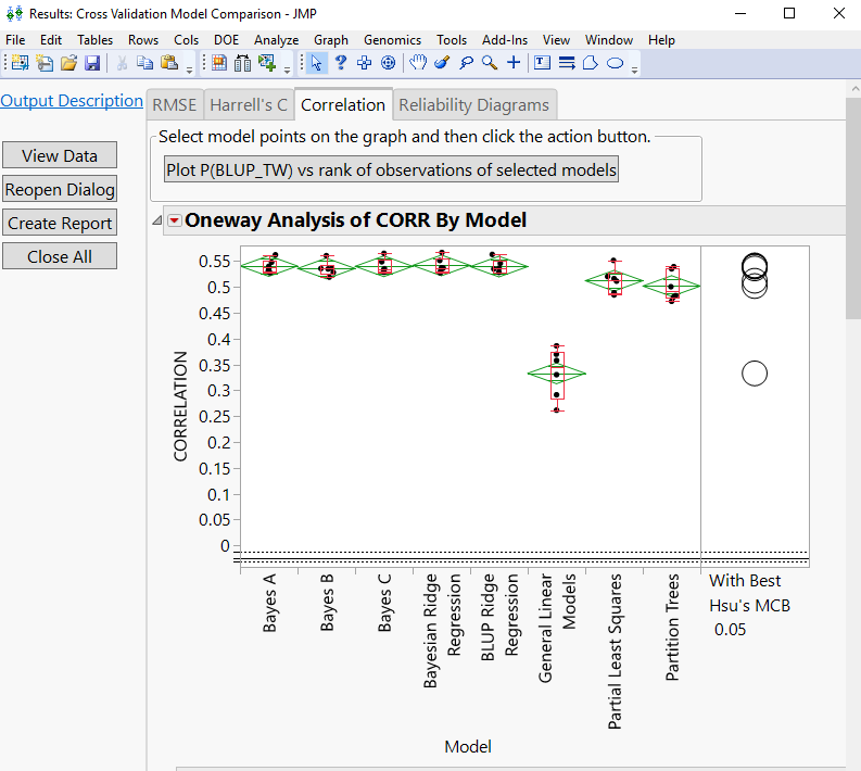 Figure bellow shows the average of correlation between predicted and observed trait values obtained by 3-fold cross validation ran for 6 iterations. Therefore, the correlation shown in the plot is the average taken over 18 runs for each tested model. While the average correlation for Bayes B is 0.5357 in the cross validation runs, the correlation for Bayes B in the entire data set without cross validation is 0.8777 (shown in the first figure). This example shows the importance of comparing models through cross validation to get more realistic measure of predictive accuracy.