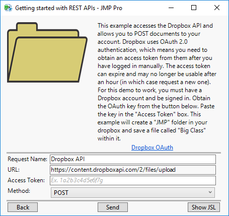 - Obtain and copy the access token and paste it into the text box below. Click “Send” once you’ve done everything. This example “POSTS” a file to your directory. A new “JMP” folder should be created in your Dropbox with the file “Big Class” in it.