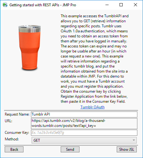 - After all of this is complete, copy the OAuth Consumer Key and paste it into the textbox below. Click “Send.” Information regarding the current Tumblr account should be obtained in a Log.