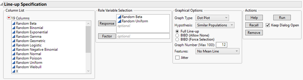 To perform a graphical hypotheses test, simply run the add-in with your data set. You can select the graph type, line-up type, and more from the add-in menu. For more detailed help, click the Help button in the actions panel for documentation.