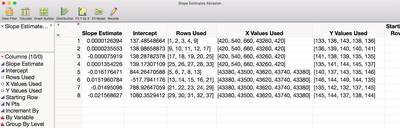 A new data table is created with the name of the original data table appended to "Slope Estimates" forming the name in this example as "Slope Estimates Abrasion.jmp".