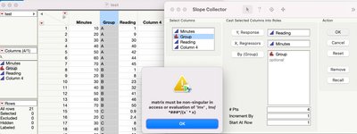 I am using JMP 16.2 and this is the data that I am trying to process using the add-in, along with the error message: