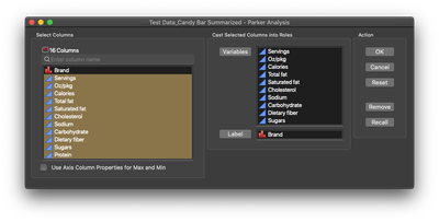 The setup is straight forward - just drop the variables of interest into the variables field and the sample/person/product ID in the Label field. A summarized version of the Candy Bar Nutrition sample data set is included to demonstrate the table set up.