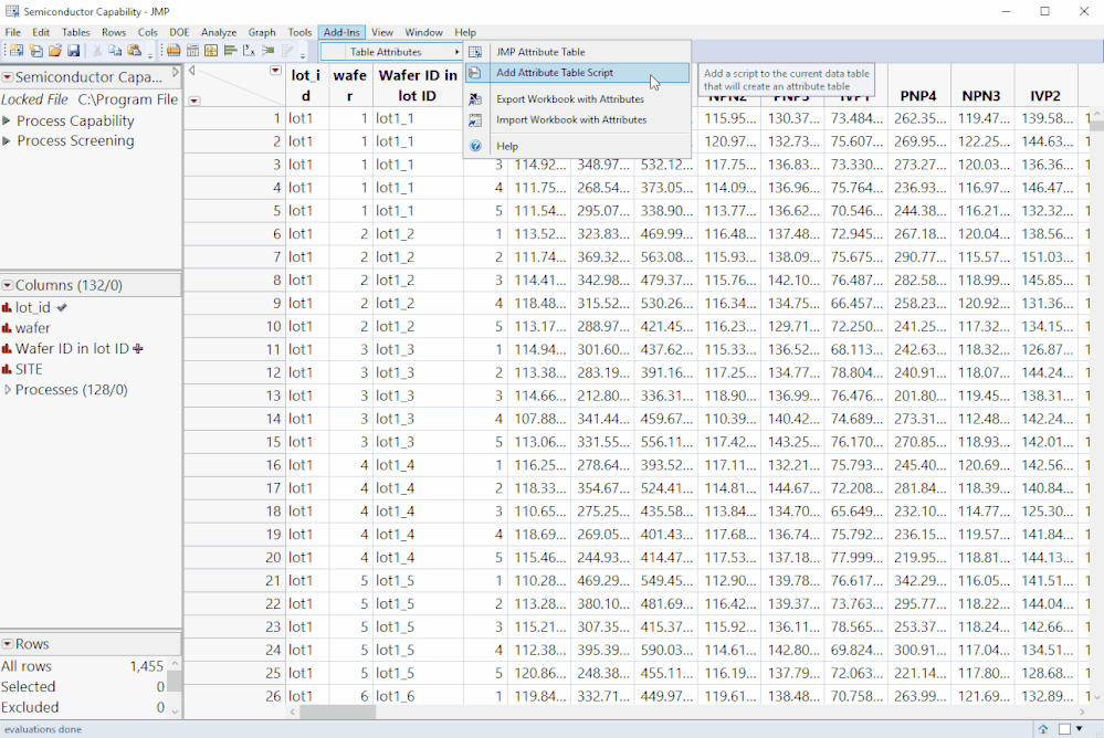 I am running into a problem. I can create the attribute table and export to Excel. However, when I want to import back into JMP (all done via the add-in), it creates a table with all the data but formulas for columns are no longer available. I also get this message: